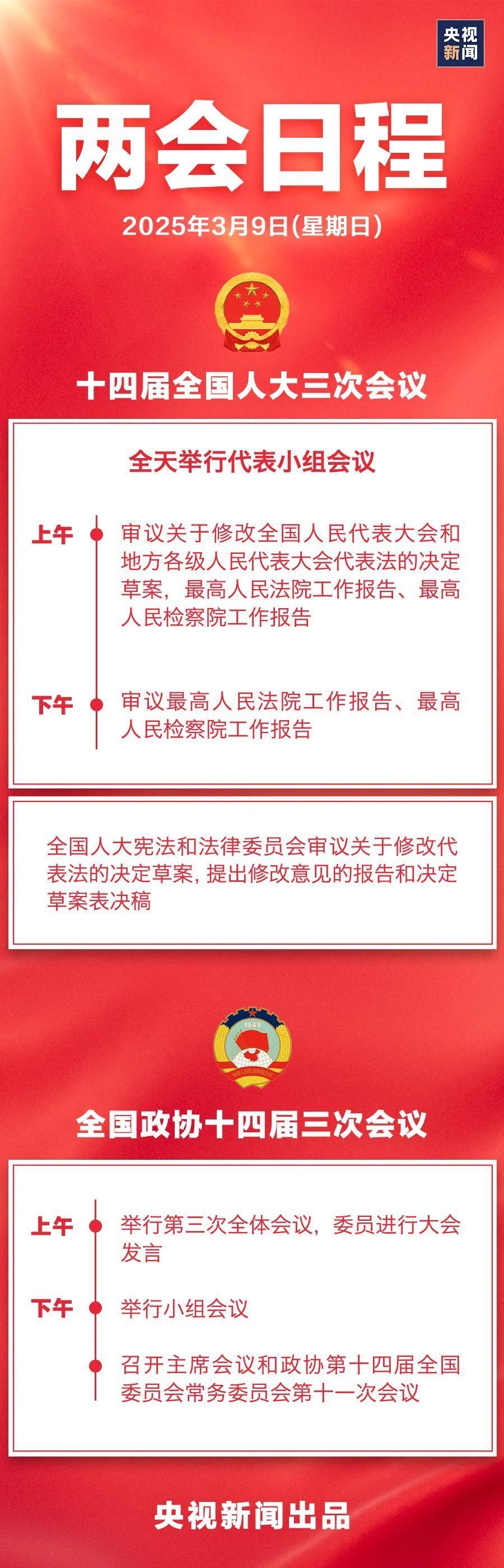 全国政协十四届三次会议9日上午举行第三次全体会议,委员进行大会发言。下午,举行小组会议;召开主席会议和政协第十四届全国委员会常务委员会第十一次会议。